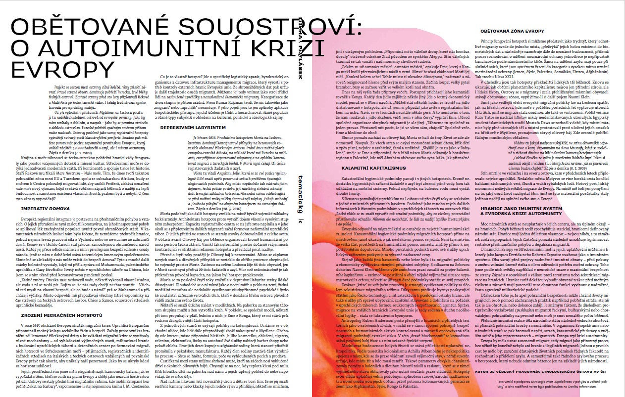 Text Obětované souostroví: o autoimunitní krizi Evropy vznikl s podporou Strategie AV21 „Společnost v pohybu a veřejné politiky“ a byl publikovaný ve slovenském měsíčníku Kapitál (č. 8, s. 22-23), jeho rozšířená verze byla publikována na Deníku referendum.