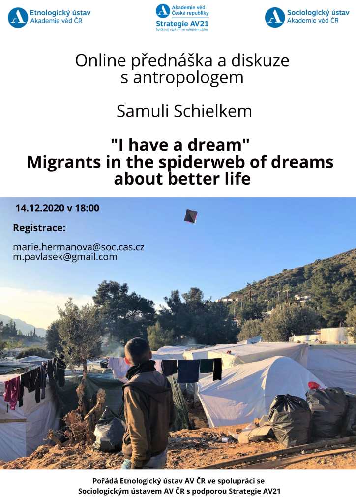 snění migrantů se dlouhodobě věnuje Samuli Schielke, „antropolog migračních snů“. Samuli představí svůj výzkum a knihu Migrants Dreams, v níž sleduje egyptské pracovní migranty v Perském zálivu, kteří se po návratu zpět do Egypta do zahraničí za prací znovu vrací. Ve své etnografii vypráví příběh společnosti, v níž migrační pohyb do metropolitních center dominuje jak „konzervativním snům“ o uskutečnění materiálně stabilního a zajištěného života, tak i snům, které překračují samozřejmou představivost dobrého života. Jedním z jeho klíčových argumentů je, že stejně jako ekonomika není pouze racionální, ani imaginace aspiračních snů není výhradně svobodná.