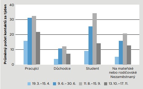 Počet sociálních kontaktů od počátku epidemie velmi kolísal a výrazně se liší podle ekonomické a sociální aktivity jednotlivce a režimu uzávěr (lockdownů). Například mezi jarem (během uzávěry) a zářím (doba rozvolnění) vzrostl průměrný počet týdenních kontaktů z 16 na 32 u pracujících, z 3 na 12 u důchodců a u studentů z 8 na 28 osob (Graf 1).