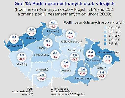 - Kraje s nejvyššími podíly nezaměstnaných jsou již tradičně Moravskoslezský, Ústecký a Karlovarský. Zdaleka nejvyšší tempo nárůstu počtu nezaměstnaných zaznamenal kraj Karlovarský (+3,1 p. b.), Ústecký a Praha (+1,7 p. b.) (Graf 12).