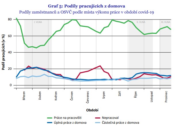 - Podíl pracujících z domova silně koreloval s vývojem epidemiologické situace. Během první (jarní), zdaleka nejmenší vlny pandemie, dosáhl podíl zaměstnanců pracujících z domova 40 %. Během diametrálně větší vlny na podzim už jen 30 %. Pravděpodobnost přechodu na práci z domova výrazně souviselo s úrovní vzdělání a odvětvím, respektive s profesí.