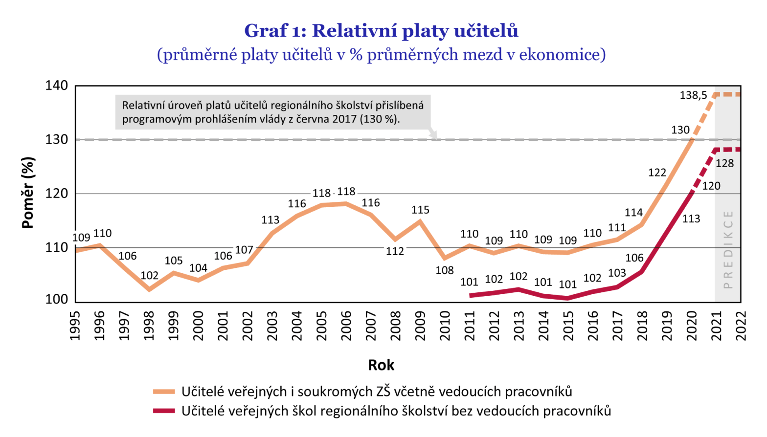 - Relativní platy učitelů v České republice (ČR) patřily až do roku 2017/2018 k nejnižším v rámci zemí EU i několika desítek ekonomicky nejvyspělejších zemí světa (OECD). Díky nebývale dynamickému tempu zvyšování v posledních letech však v roce 2021 téměř dosáhnou úrovně průměru OECD i EU, tedy zhruba 90 % průměru mezd vysokoškolsky vzdělaných zaměstnanců v ekonomice. Končící vláda Andreje Babiše tak naplní slib ze svého programového prohlášení z léta roku 2018.