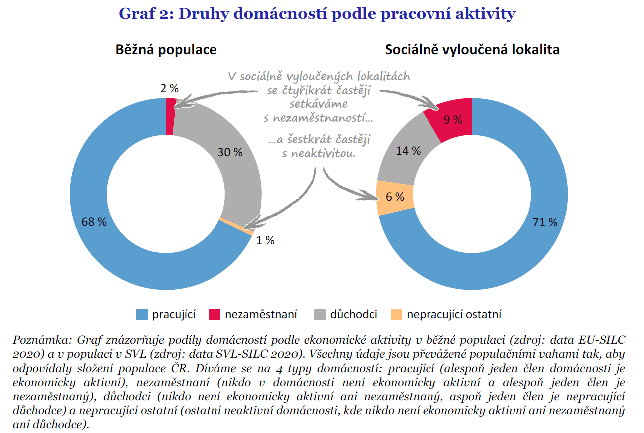 - V domácnostech v SVL, oproti běžným domácnostem, žije v průměru více osob a jejich průměrný věk je nižší, zejména z důvodu nižšího podílu domácností důchodců. Populace SVL má výrazně nižší úroveň dosaženého vzdělání. Podíl osob, které dosáhly pouze vzdělání bez maturity tam je 85 % oproti 40 % v běžné populaci. V domácnostech žijících v SVL se až 4krát častěji setkáváme s problémem nezaměstnanosti a ekonomické neaktivity než v domácnostech běžných.