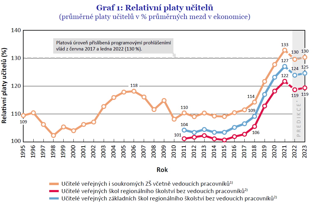 - Udržení dosažené relativní úrovně učitelských platů v dalších letech bude vyžadovat jejich zvyšování tempem růstu nominálních mezd v ekonomice. Ve výhledu roku 2022 relativní platy učitelů však zřejmě mírně poklesnou na 119 %. Za slibů daných v létě při vyjednávání vlády s odbory se tam zřejmě udrží i v roce 2023. Minulou i současnou vládou přislibované úrovně 130 % učitelské platy rozhodně nedosáhnou, platy širší skupiny pedagogických pracovníků už vůbec ne.