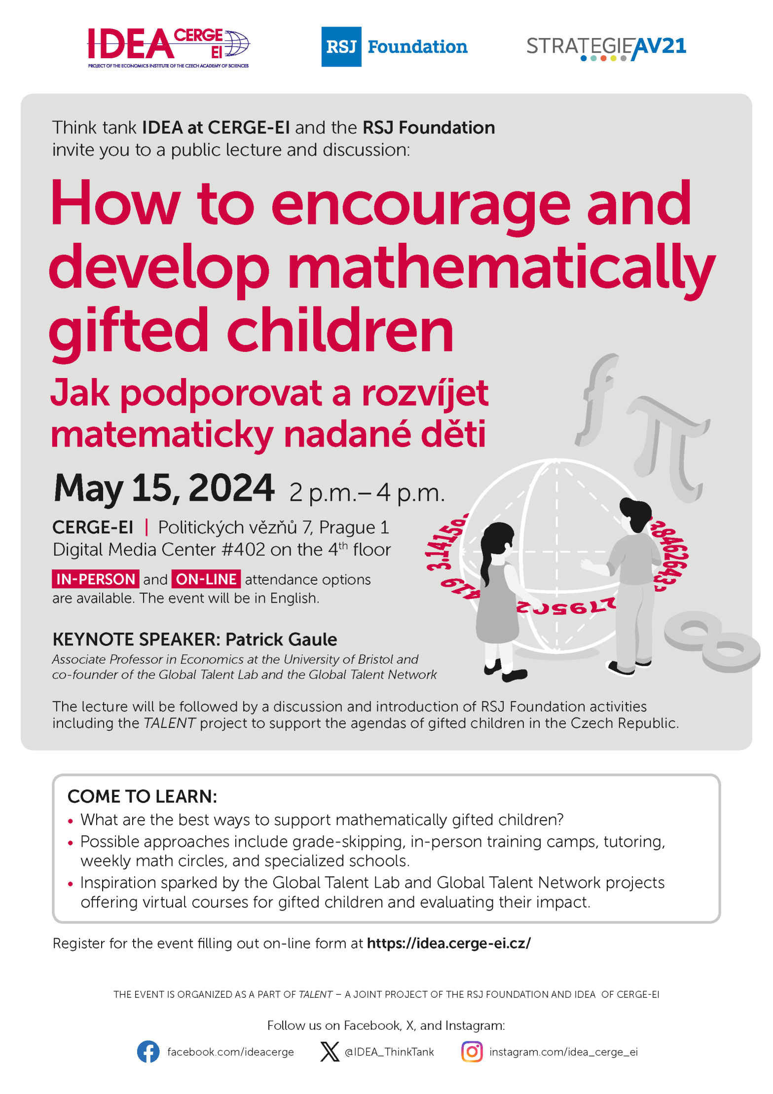 IDEA think tank of CERGE-EI and the RSJ Foundation invite you to a public lecture and discussion: How to encourage and develop mathematically gifted children/Jak podporovat a rozvíjet matematicky nadané děti